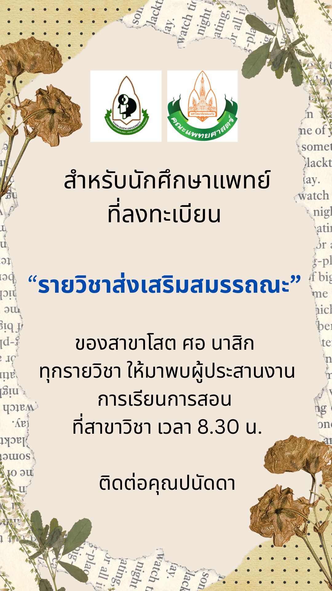 สำหรับนักศึกษาแพทย์ที่ลงทะเบียน "รายวิชาส่งเสริมสมรรถณะ" ของสาขาโสต ศอ นาสิก ทุกรายวิชา ให้มาพบผู้ประสานงาน การเรียนการสอนที่สาขาวิชา เวลา 8.30 น. ติดต่อคุณปนัดดา