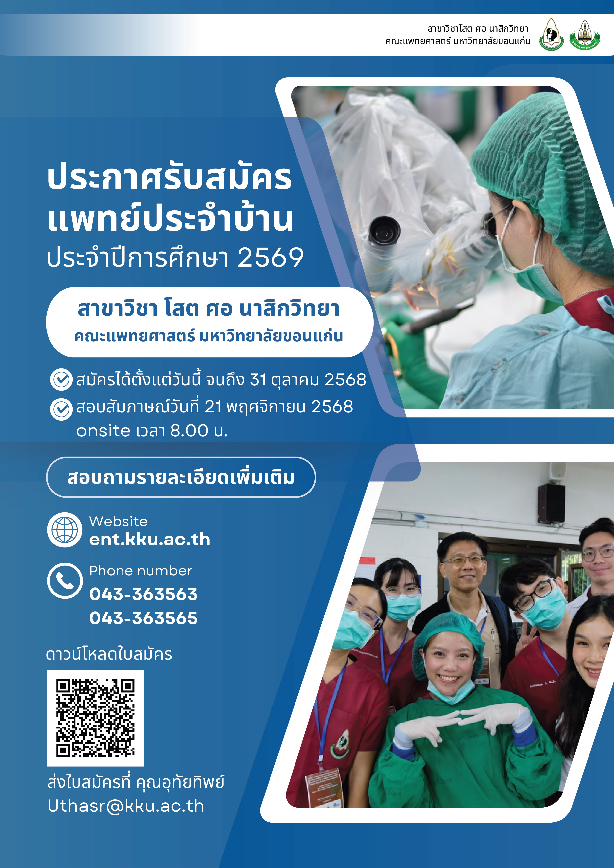 ประกาศรับสมัครแพทย์ประจำบ้าน ประจำปีการศึกษา 2569 สาขาวิชา โสต ศอ นาสิกวิทยา คณะแพทยศาสตร์ มหาวิทยาลัยขอนแก่น